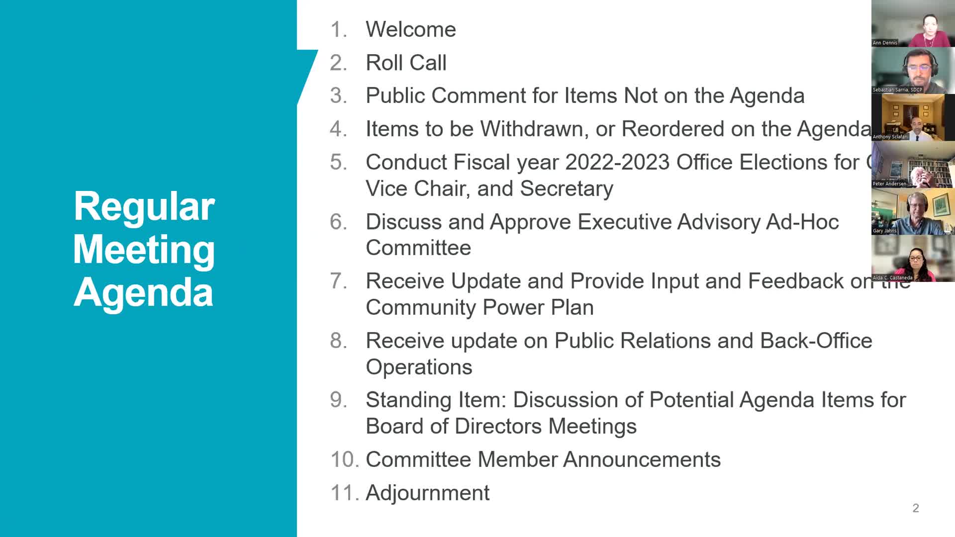 At its Aug. 12 meeting the San Diego Community Power Community Advisory Committee re-elected Eddie Price as chair and installed an executive advisory ad hoc group to meet monthly and advise staff; vice chair Aida Castaneda and Anna Webb will continue in leadership roles.
