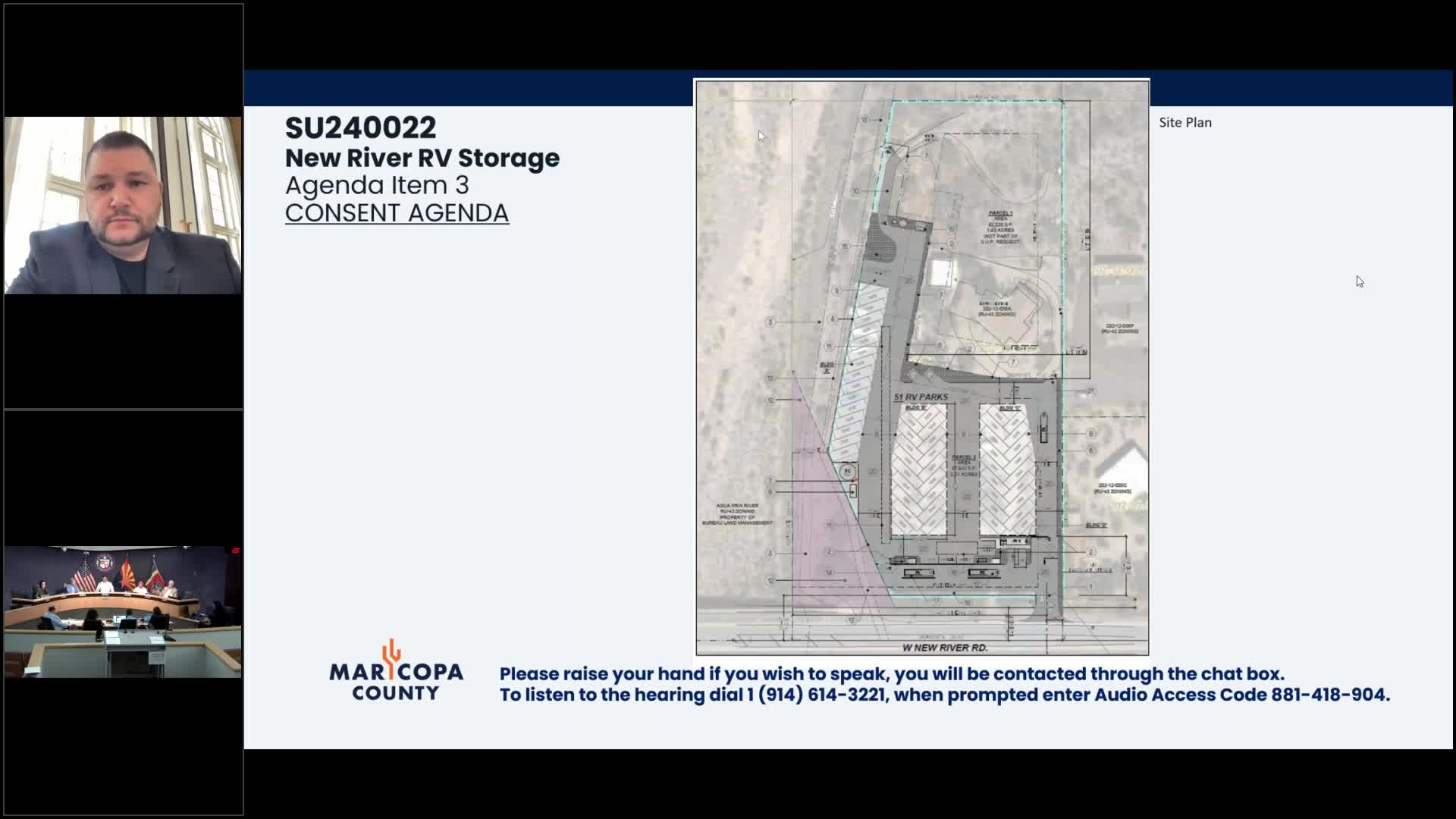 The Maricopa County Planning and Zoning Commission voted 9–1 on May 8 to recommend approval of case SU240022, a special-use permit for an RV and boat storage facility on about 2.1 acres near the northeast corner of Black Canyon Highway and New River Road in the New River area.