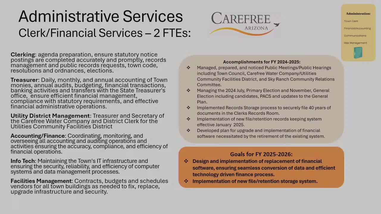 Town Clerk Kristen Cray and Town Accountant Jim Keane described a planned replacement of the town’s 2002 financial system with Tyler Technologies’ ERP 10 (data transfer and implementation planned for FY2026), a fee study and a Laserfiche records retention migration.