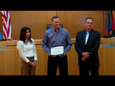 At its April 7 study session the Chandler City Council recognized three employees for milestone service: an airport staffer marking 10 years, a public works employee marking 25 years and a detective marking 30 years.