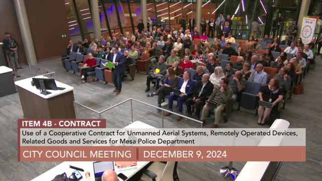 The Mesa City Council unanimously approved multiple purchasing items on Dec. 9, including a cooperative contract to acquire unmanned aerial systems and related services for the Mesa Police Department, a dollar‑limit increase on a cooperative hardware contract (Maricopa County contract), and a short extension and dollar increase to the current contract for light‑duty and police vehicle maintenance while the city completes a new procurement.