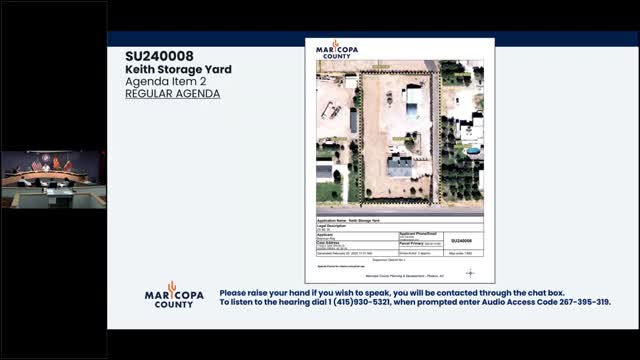 County planning staff described Z240021 as a zone change to Industrial-2 IUPD for an 8.9-acre parcel at the southwest corner of Happy Valley Road and Seventh Avenue in the Deer Valley area. Staff noted the City of Phoenix general plan designates the area for industrial use and that the IUPD designation limits uses because of the lack of sewer; the change resolves an existing zoning violation related to storage yards and will require a plan of development (POD) at a later date.