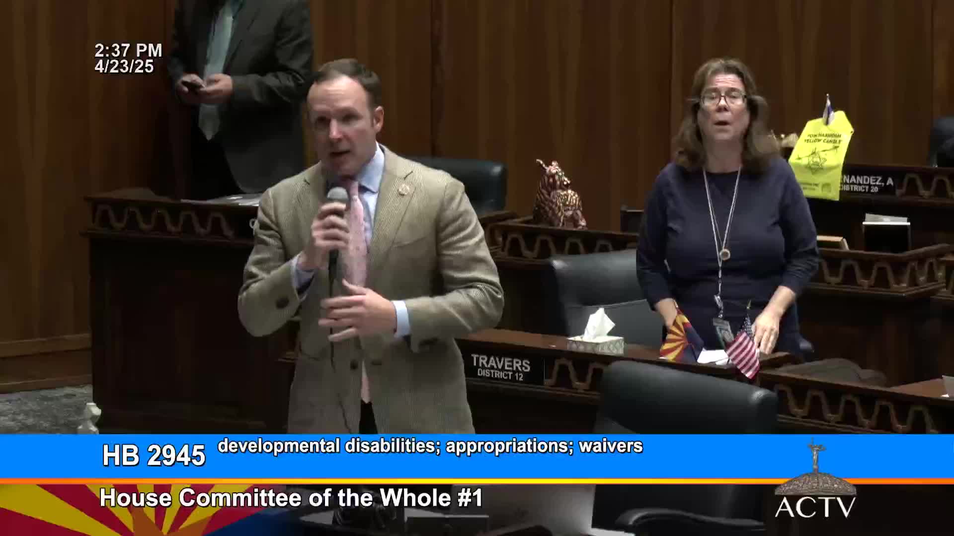 The Arizona House of Representatives approved House Bill 2,945 as an emergency measure Wednesday, 48-11-1, moving a supplemental funding and oversight package aimed at preventing the Division of Developmental Disabilities (DDD) from running out of money. The bill, carried through the Appropriations process and amended on the floor, includes a new funding source and requirements for legislative review of certain Medicaid waiver changes.