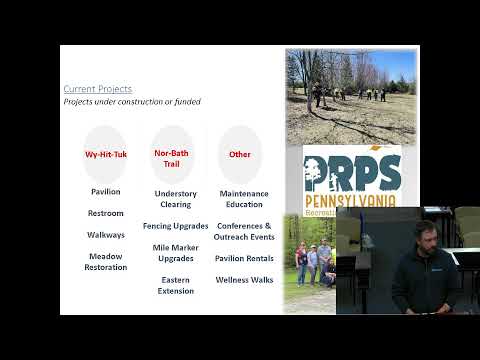 Parks staff presented a spring update on staffing, habitat restoration, major projects including dam removals, Minsi (Mincey) Lake upgrades, an 85-acre Gulf Farm meadow restoration, a $550,000 LWCF award for Bear Swamp work, and a host of partnerships with colleges, conservation groups and Pennsylvania Game Commission.