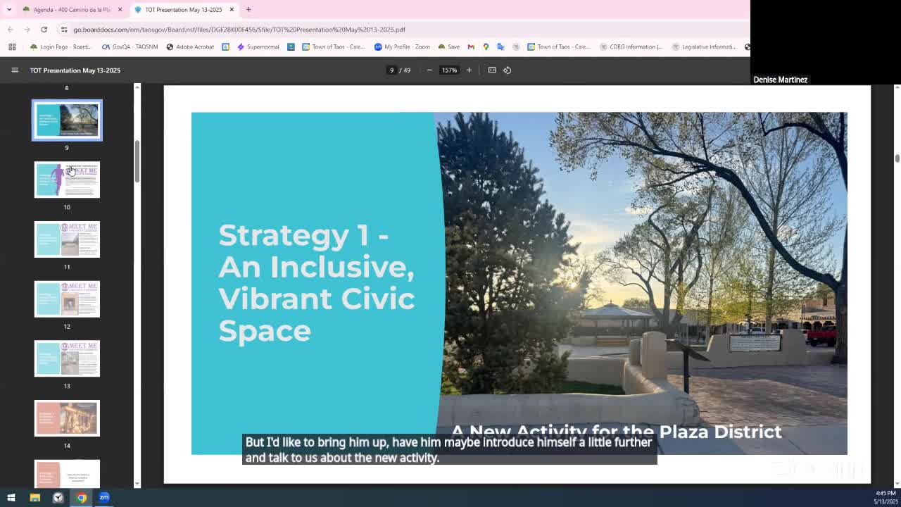 Taos Main Street presented updates to the Town Council on May 13 detailing three strands of downtown work: a new weekly community activity series at McCarthy Plaza, development of a Business Resource and Innovation Center (BRIC) on Civic Plaza Drive, and the Destination Stewardship Network intended to guide tourism growth.