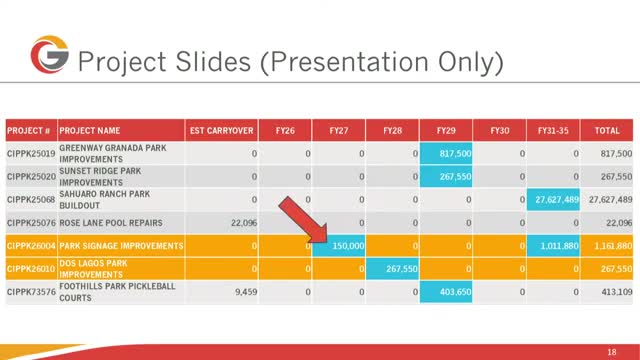 Staff explained that projects highlighted in blue in the presentation indicate items that need future general obligation bond authority for parks, libraries or government facilities. “The numbers identified here in the blue boxes are projects that we currently don't have a funding source for,” Assistant City Manager Vicky Rios said. Staff said the city will conduct community outreach with a consultant to test bond appetite and to refine a bond package if council chooses that route.