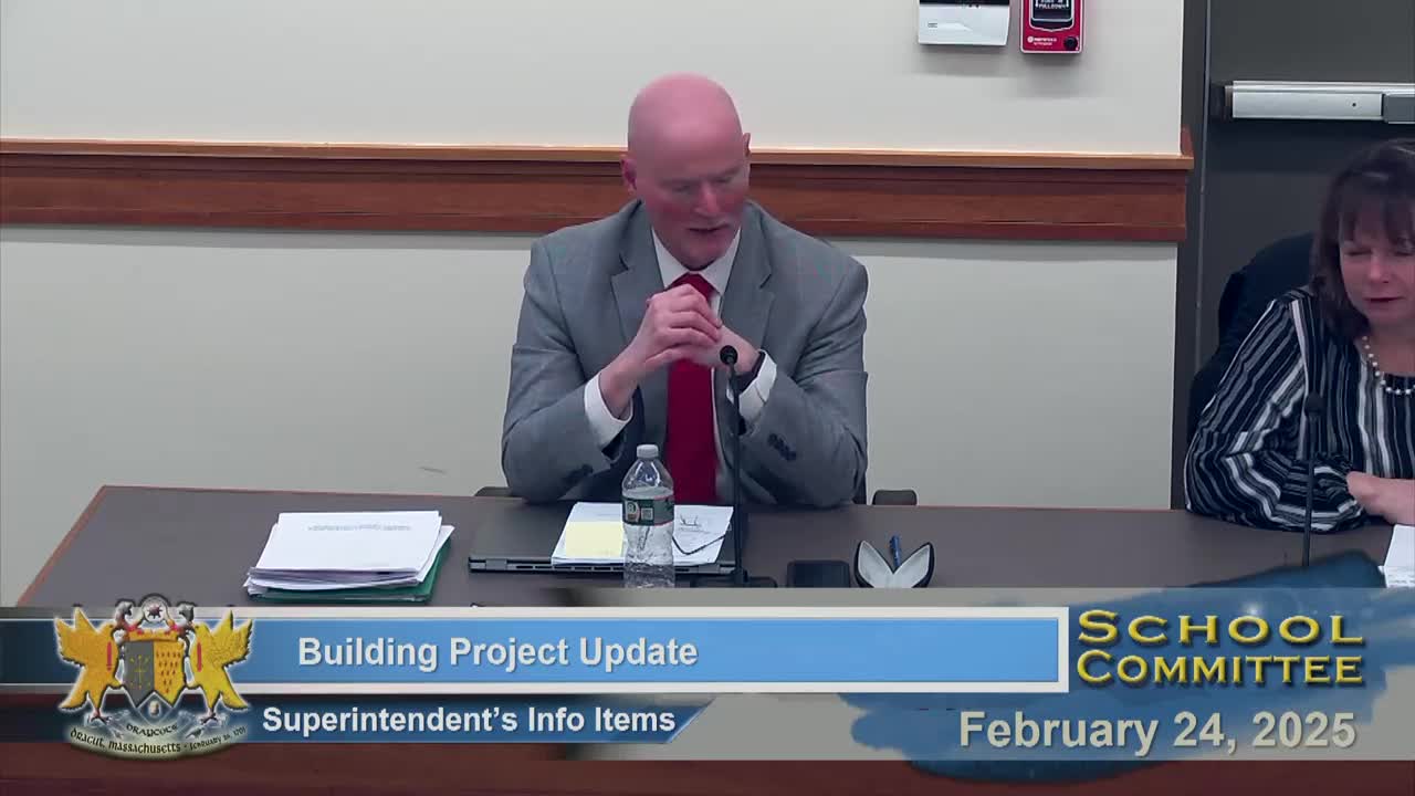 Superintendent Steven Stone told the committee the administration and architects are finalizing a preferred design to submit to the Massachusetts School Building Authority (MSBA). The timeline presented calls for the Building Committee to select either a new‑building or add/reno option; if the committee approves a schematic, the MSBA process would proceed into a period of detailed schematic design.