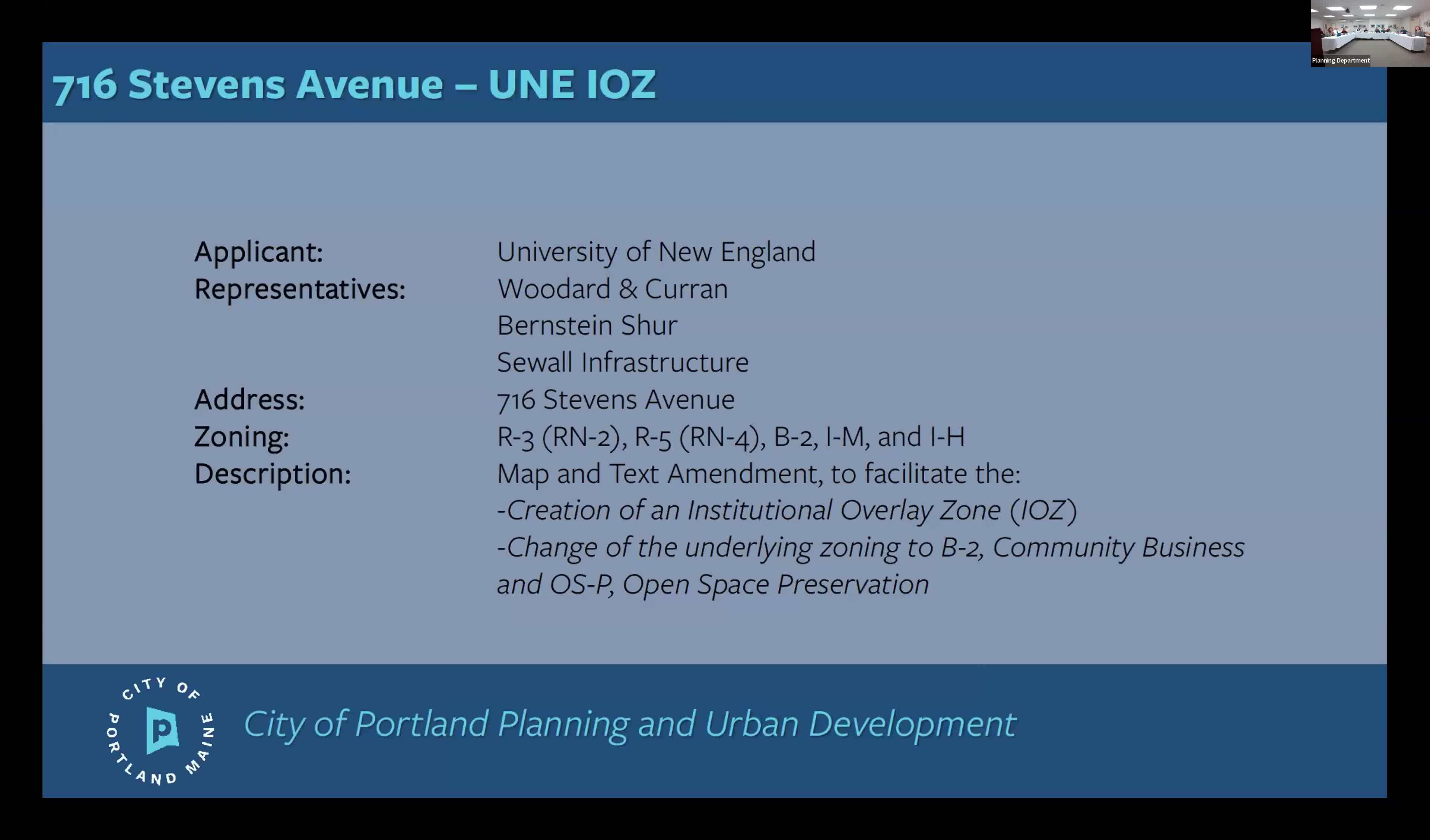 The Planning Board unanimously recommended that City Council adopt an Institutional Overlay Zone for the University of New England’s Portland campus, including an Institutional Development Plan, regulatory framework and an open‑space/maximum‑height map with explicit open‑space protections.