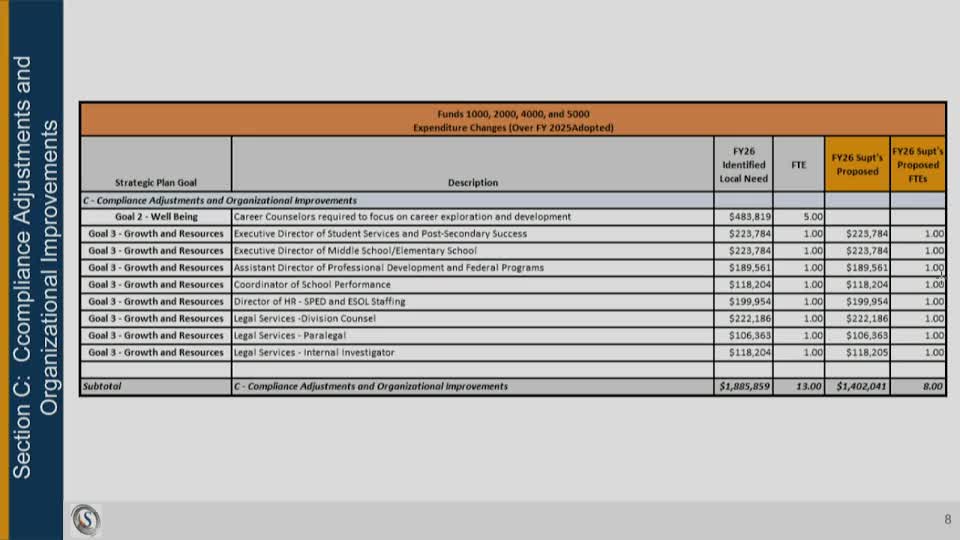 Superintendent Dr. Mitchell proposed adding internal legal capacity — a division counsel, a paralegal and an internal investigator — to reduce reliance on outside law firms for day‑to‑day matters and to free HR staff for other work. The superintendent said outside counsel remains necessary for specialized matters but that an on‑site attorney would improve responsiveness and could reduce annual outside‑counsel costs.