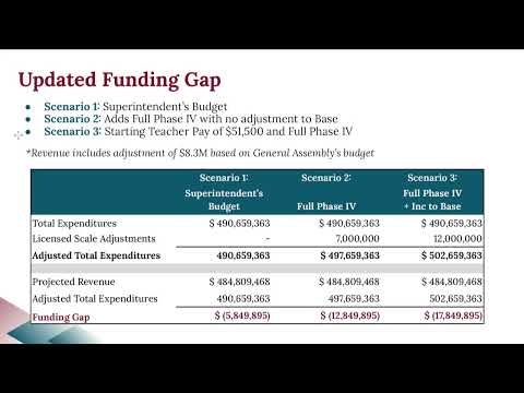 Key figures and scenarios presented by staff showed the sensitivity of the budget to state revenue and pay decisions. With the governor’s and General Assembly’s proposed state funding, staff said recurring state revenue could rise by about $18.8 million and total projected revenue by roughly $24 million, but portions of that increase remained uncertain until the governor signs the budget. The superintendent’s baseline budget reduced the division’s funding gap under one scenario to roughly $5.8 million; expanding to the full teacher phase 4 added about $7 million to that baseline and pushed the gap higher under other scenarios. Staff also said a $5 million proposed local transfer was already included in some calculations and would be added to the board’s county request.