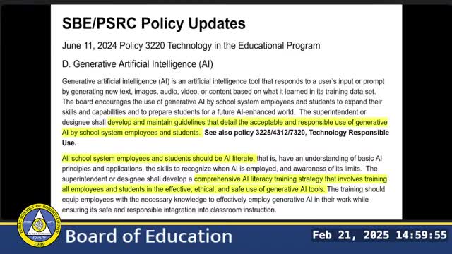 The board did not adopt a formal policy at the meeting; staff said the district will align local guidance with pending State Board of Education policy updates and continue principal and staff training through spring and summer.