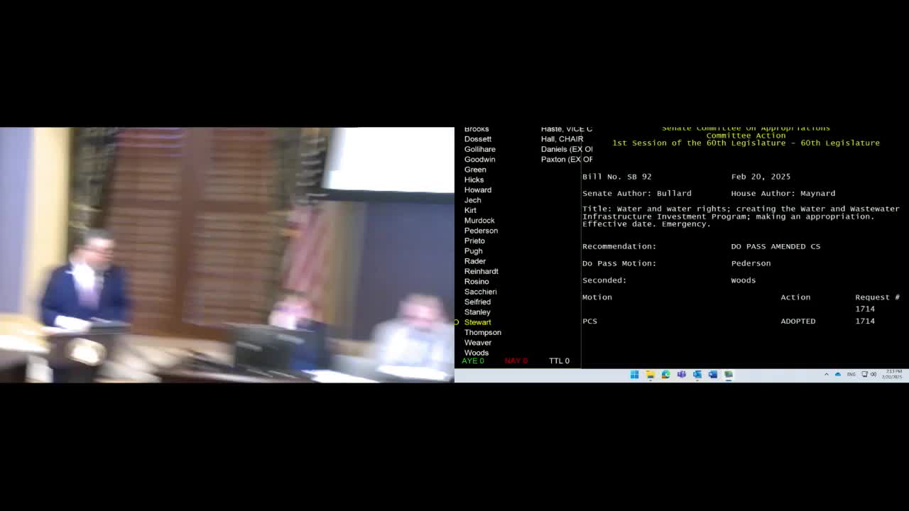 SB92 — Water and wastewater infrastructure loan program - Action: Bill advanced in committee and floor roll call recorded. - Description: Creates a revolving loan fund to finance municipal water and wastewater projects prioritized for small communities; OWRB expected to administer and set fees; final appropriation to be determined. - Vote: 19 ayes, 5 nays (clerk recorded; bill declared to advance)