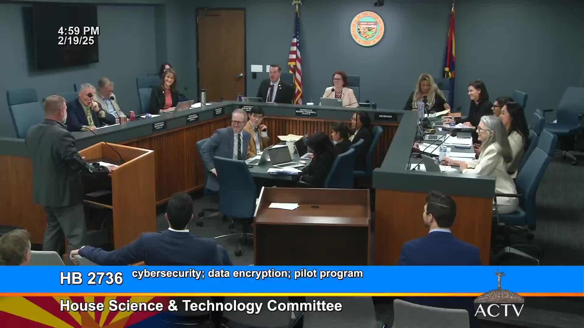 The Science and Technology Committee advanced House Bill 2736, a five-year pilot program to modernize encryption and cyber defenses for key Arizona state agencies, with the Secretary of State marked for initial implementation.