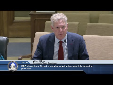 Mitch Killian of the Metropolitan Airports Commission testified on Senate File 1184, which would exempt construction-material sales tax for airport projects at Minneapolis–St. Paul International Airport. Killian told the committee that the commission finances projects with airport revenue bonds; exempting state sales tax would reduce bond borrowing and interest costs, freeing capital to be reinvested in airport projects and regional air service.