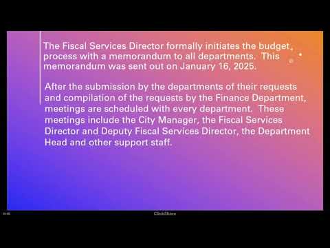 A city finance presenter walked commissioners through the annual budget calendar, fund accounting, reserve policy and key revenue and expenditure categories ahead of the 2025–26 budget cycle.