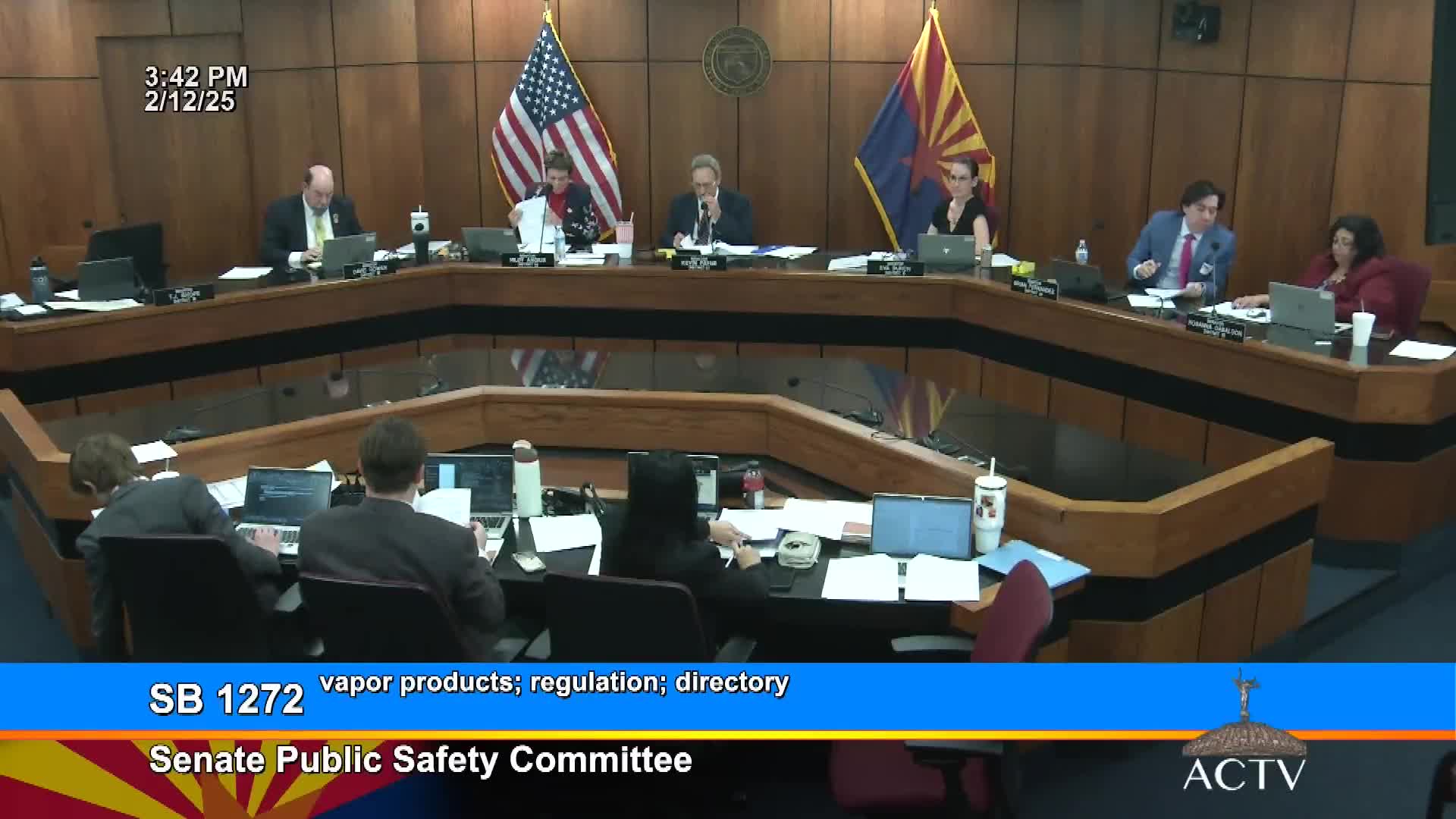 The Senate Committee on Public Safety approved SB 1272 with an amendment requiring manufacturers of vapor products sold in Arizona to obtain annual certification from the Arizona Department of Liquor Licenses and Control. The committee vote was 5‑2 on a bill that drove the longest night‑of hearing in the session, with four speakers on each side presenting sharply different evidence about youth vaping, illicit imports and the federal premarket tobacco application (PMTA) process.