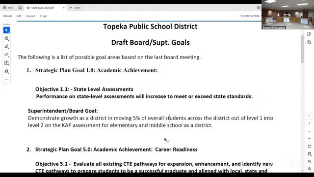 Topeka Public Schools trustees spent a substantial portion of their meeting reviewing draft goals aligned to the district strategic plan and asked staff to return with measurable baselines and implementation detail.