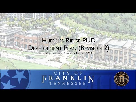 Developer representatives outlined a revision to the Huffines Ridge Planned Unit Development during a required neighborhood meeting for Franklin City, saying the proposal would replace previously approved high-rise office and a six-story hotel with two-story retail, restaurant and office buildings and surface parking along Carothers Parkway between Liberty Pike and McEwen Drive.