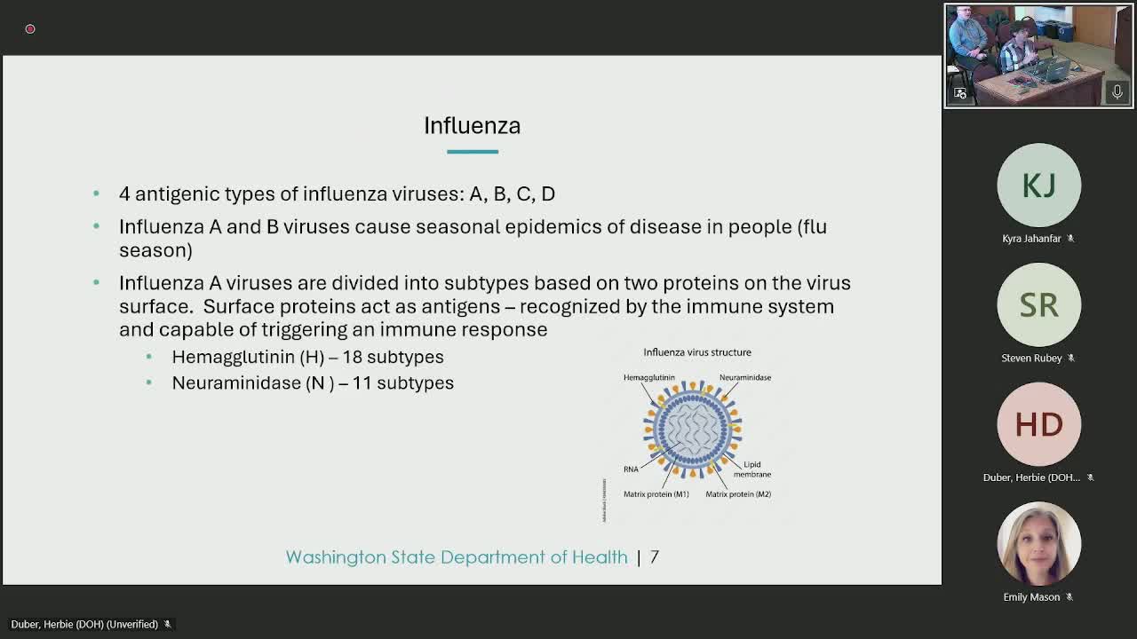 Board members asked about vaccination trends for seasonal respiratory viruses; Duber said flu vaccine uptake has not improved and COVID vaccination levels have declined compared with earlier years, and he emphasized that vaccines reduce severe illness and death even when they do not prevent every infection. He also urged providers to ask about exposure to birds or animal contact when evaluating patients with flu-like illness so public-health partners can decide whether to request specialized testing.