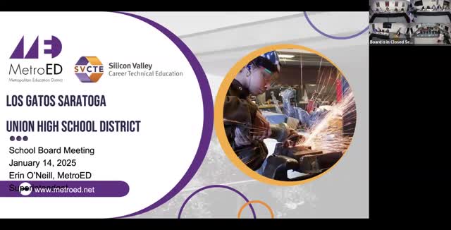 Erin O'Neil, new superintendent of MetroEd, briefed the board on Silicon Valley Career Technical Education (SVCTE). Enrollment at SVCTE is up, programs offer college credit and internships, and MetroEd aims to improve retention and expand industry partnerships.