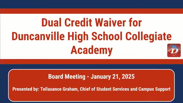 The request, presented by Mr. Graham, sought board approval “to submit a waiver to the Texas Education Agency for Duncanville High School Collegiate Academy.” Graham said the waiver is intended to align the district calendar with Dallas College’s Monday–Thursday schedule and “ensure full state funding for our students in the dual credit program.”