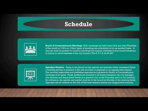 The city manager delivered a 46‑slide orientation to the Board of Commissioners reviewing Fairview’s municipal charter, government structure, departments, meeting procedures and recent departmental initiatives.