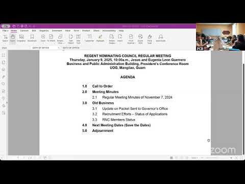 The University of Guam Regent Nominating Council reviewed candidate packets, set a Jan. 24 submission deadline and scheduled a Feb. 6 special meeting with an executive session and voting file to fill two soon-to-be vacant Board of Regents seats; the council also approved its Nov. 7 minutes.