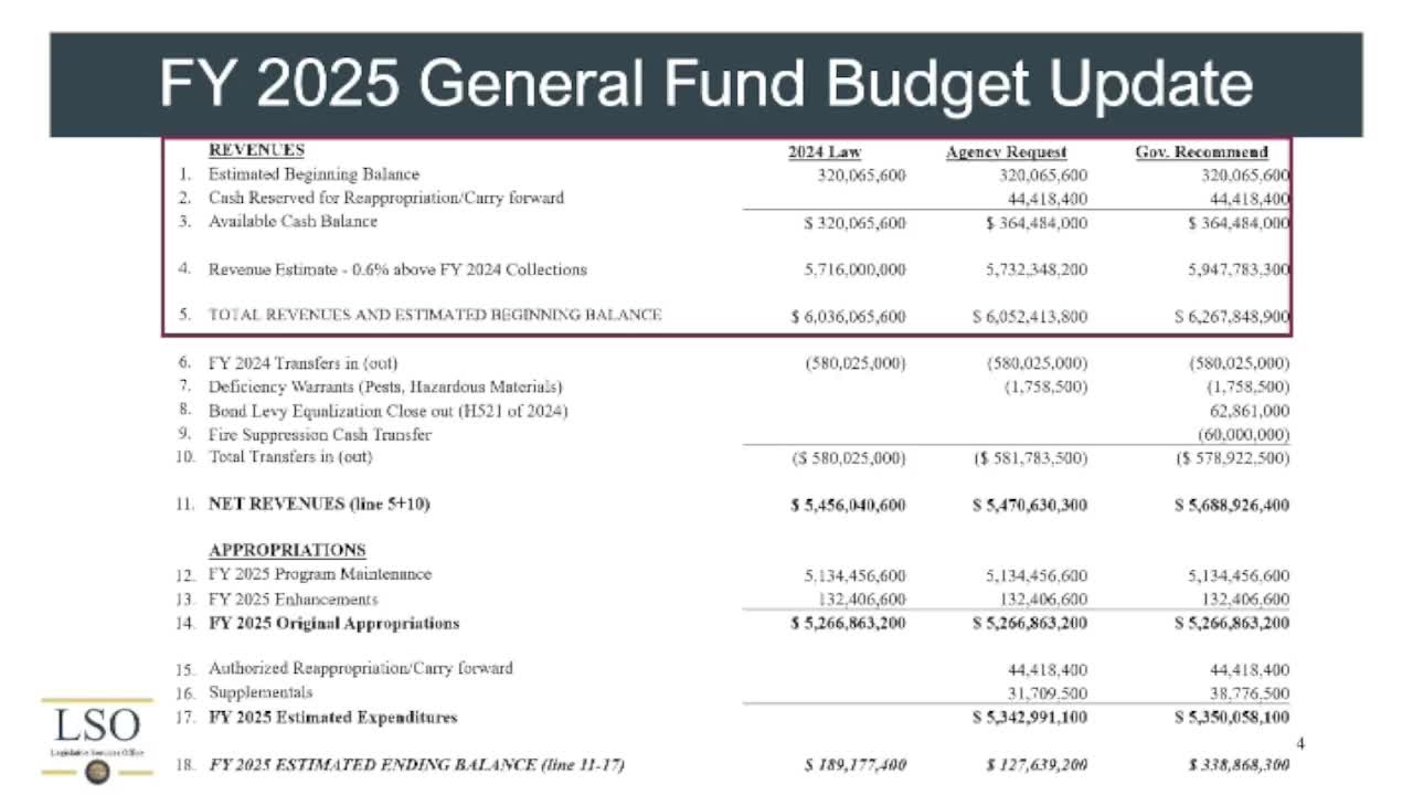 Why it matters: these cash transfers and carry-forward mechanics change the available cash the Legislature can appropriate. Bybee emphasized the importance of reading the front-end reconciliation pages in the budget book and noted the committee will examine these items in working groups and agency hearings.