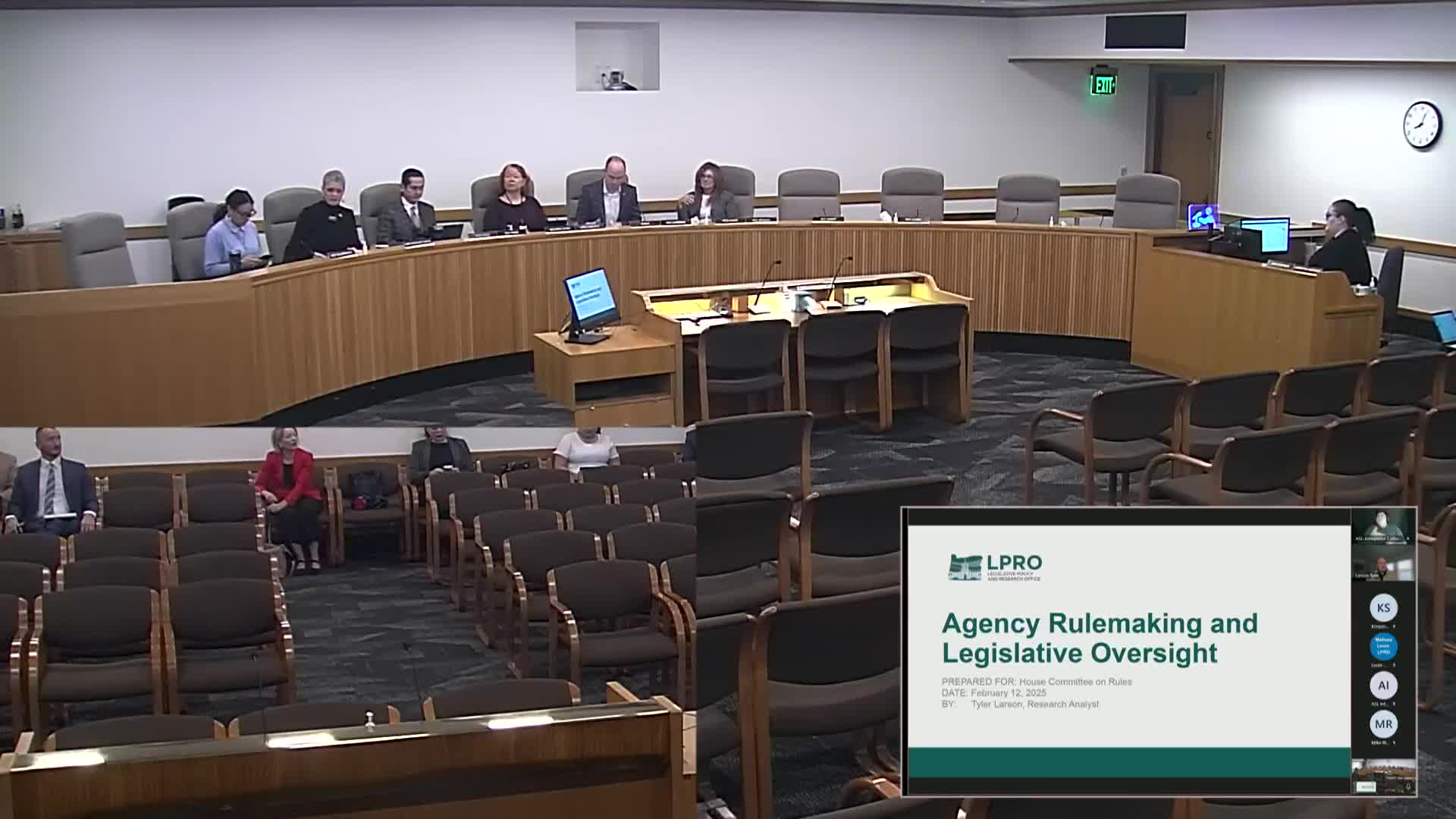 The House Committee on Rules heard an informational briefing on state administrative rulemaking on Feb. 12, when Legislative Policy and Research Office analyst Tyler Larson reviewed statutory processes and Department of Administrative Services Director Mary Lehi described executive-branch efforts to standardize agency communications.