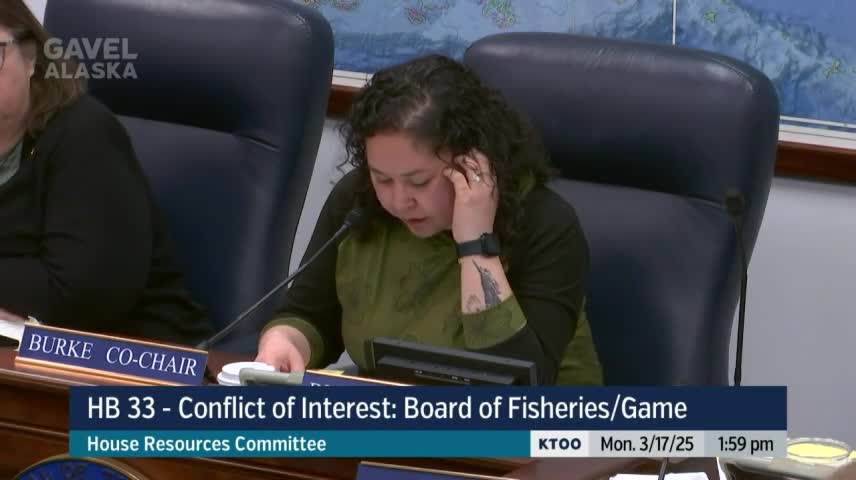 The Alaska House Resources Committee voted 5-4 on March 17, 2025, to advance House Bill 33, which would let members of the Board of Fisheries and the Board of Game who disclose an interest remain in deliberations to answer technical questions while barring them from voting if the chair or a majority determines a conflict exists.