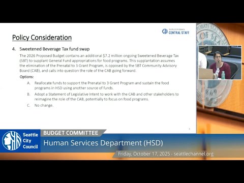 Central staff described a proposed reallocation that would use additional sweetened beverage tax (SBT) revenues — presented as roughly $7.2 million ongoing in the 2026 proposal — to supplant some general‑fund spending on food programs. Staff said the proposed budget would rely on a fund swap with the Families, Education, Preschool and Promise (FEPP) levy and that the SBT community advisory board had not been consulted and opposed the proposed use and the proposed elimination of the prenatal‑to‑3 grant program. Staff said the prenatal‑to‑3 program as discussed in the briefing carries approximately $1.5 million in funding and is proposed for elimination in the 2026 package.