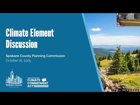 Spokane County Planning Commission members and county staff reviewed draft goals and policies for a new climate and resiliency element on Oct. 16, 2025, hearing presentations from consultants with Cascadia Consulting Group and public comment about implementation costs, forest management and local infrastructure needs.