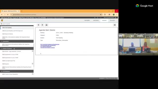 The Northwestern Lehigh School District board received first readings of several policy revisions, including Policy 227 (controlled substances/paraphernalia), Policy 716 (integrated pest management), Policy 717 (cellular telephones) and Policy 718 (service animals in schools).