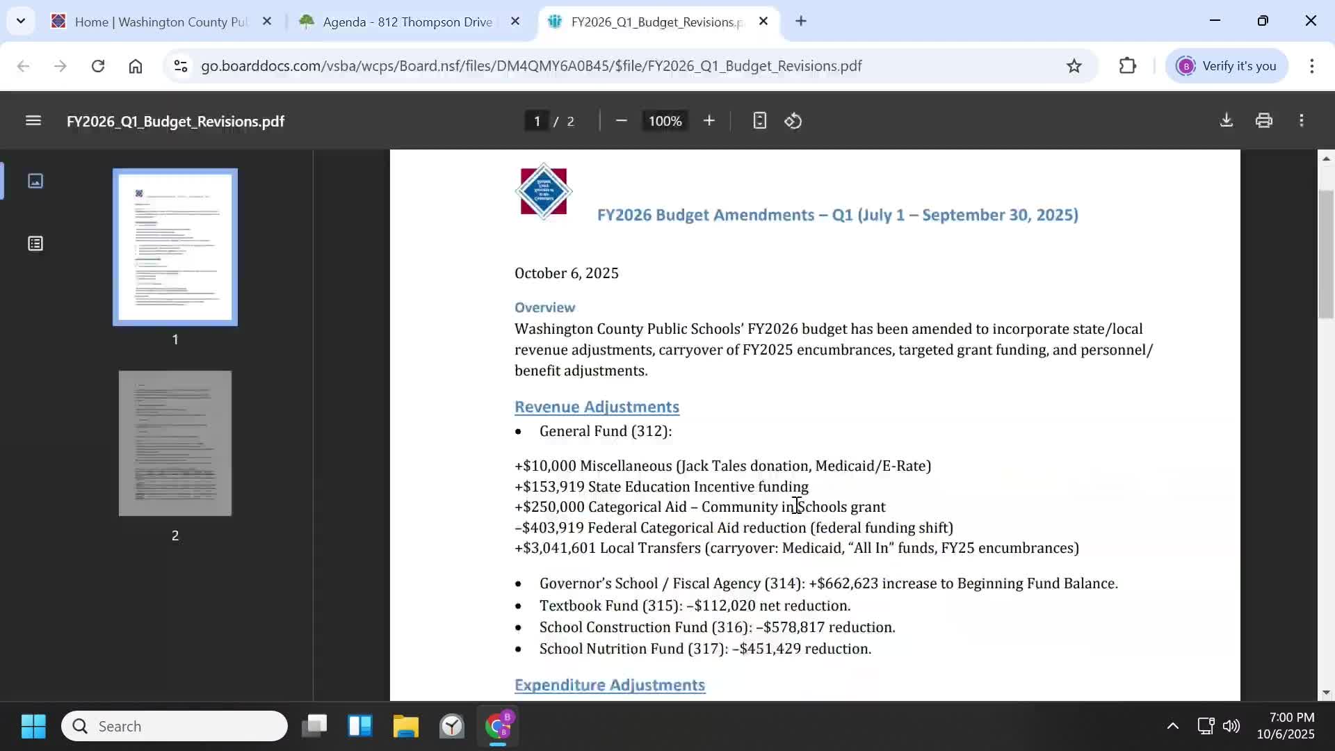 - The district’s operating budget is approximately $127,000,000; the board was informed that the first quarter of the fiscal year is complete (25% of the year). - A supplemental carryover appropriation from the board of supervisors adjusted beginning balances for the governor’s school textbook fund, fiscal agency fund and the school nutrition fund, and allowed previously requested carryovers to be recognized. - New or unbudgeted revenues reported included about $250,000 for a Communities in Schools award, a security grant for $153,009.19, and a $10,000 Jack Tales donation tied to an elementary school play/community partnership. - Expenditure adjustments included transportation carryovers for bus purchases and other items; an actuary result allowed the district to recognize approximately $100,000 related to supplemental retirement funding and personnel budgeting. - The district will post purchase orders for heavy equipment and begin recruitment for a heavy equipment operators teacher to support a new career‑technical offering; officials described strong local employer interest in partnering for training.