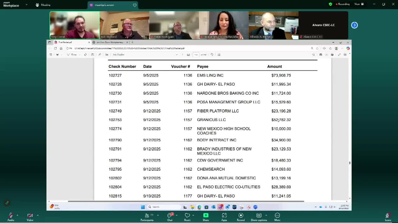 Tony Caral and other finance staff summarized non-payroll disbursements for September, reporting total non-payroll disbursements of $6,043,640.95 (34.7% in checks and 65.3% ACH). Board member Frank asked about specific vendors and invoices. Finance staff described EMSLink (nutrition inventory and menu planning), Granicus (board meeting streaming and captioning), RelayHub (school-based Medicaid claiming and provider scheduling), and examples of vendors used for curtains, gym equipment and CTE course materials.
