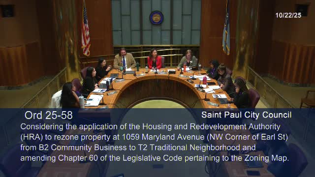 - Rezoning adopted: The council gave final adoption to the Housing and Redevelopment Authority’s application to rezone 1059 Maryland Avenue from B2 (community business) to T2 (traditional neighborhood) and amended Chapter 60 of the legislative code. The ordinance was adopted by a council vote recorded as 7 in favor, no one opposed.