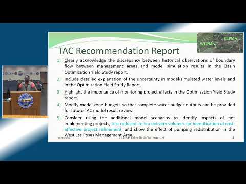 Dr. Farai Kaseke, agency staff, presented a Watermaster response to the Policy Advisory Committee's recommendation report on an in‑lieu program to purchase imported water from Calleguas Municipal Water District for basin replenishment. The board voted to approve the Watermaster response report, but members requested additional clarity before any implementation.