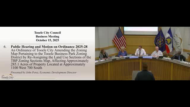 The Tooele City Council on Oct. 15 adopted Ordinance 2025-28, updating the Tooele Business Park (TBP) zoning map and reassigning land-use sections across approximately 285.1 acres near 1100 West and 700 South.