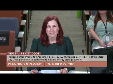 The Mesa Planning and Zoning Board on Oct. 22 voted to recommend that City Council adopt a text amendment to Title 11 establishing definitions, zoning table entries and development standards for battery energy storage systems (BESS). The board approved staff’s overall recommendation but directed two specific changes: reduce the residential separation requirement from 1,000 feet to 400 feet, and ask staff to re‑examine the accessory‑use threshold by evaluating whether a 5‑megawatt cumulative cap (rather than the 1‑megawatt threshold in the draft) would be more appropriate.