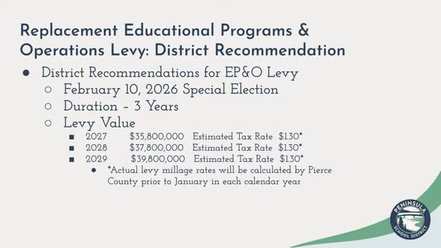 The Peninsula School District Board of Directors on Oct. 21 approved Levy Resolution 25‑12 to place a replacement EP&O levy on the Feb. 10, 2026 ballot, asking voters to authorize $35.8 million in the levy’s first year (2027).