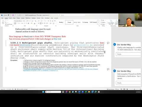Public comment and standards timing: Patrick Hanks of the Building Industry Association of Washington was present for public comment. Prashant Inamdar, representing Rheem Manufacturing and a voting member of ASHRAE PC 15, asked the committee to note that the referenced ASHRAE addendum (addendum b to ASHRAE 15 for the 2024 edition) had been in public review and was not yet finalized; he cautioned the committee that the language could change during subsequent public review. Committee members acknowledged that concern but said the current draft language largely reflects the second public review draft and is unlikely to change materially; they also noted there are mechanisms for editorial changes later if necessary.