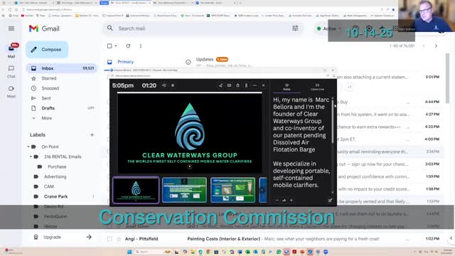 Mark Bellora of Clear Waterways Group presented a patent-pending dissolved-air flotation (DAF) barge that the company says can remove algae, duckweed and nutrient-bound solids; commission members questioned shallow depths, wildlife impacts and permit requirements.