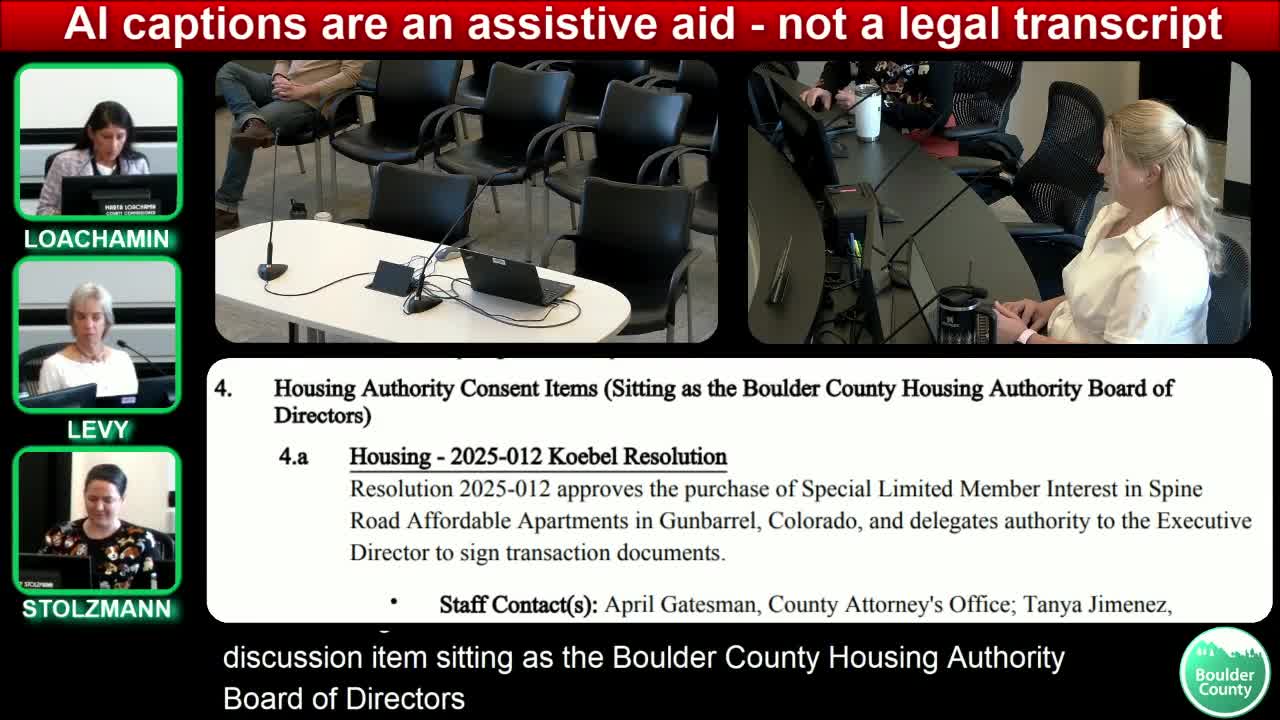 The Boulder County Housing Authority board voted to approve a resolution authorizing participation in a special limited partnership to own an affordable housing complex in Gunbarrel after questions about management-change protections and final transaction documents were discussed.
