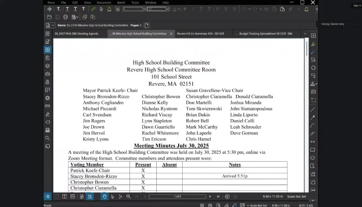 The Revere School Building Committee approved the minutes from its July 30, 2025 meeting and voted to process a set of July invoices, including payments to Perkins Eastman and Consigli Construction.