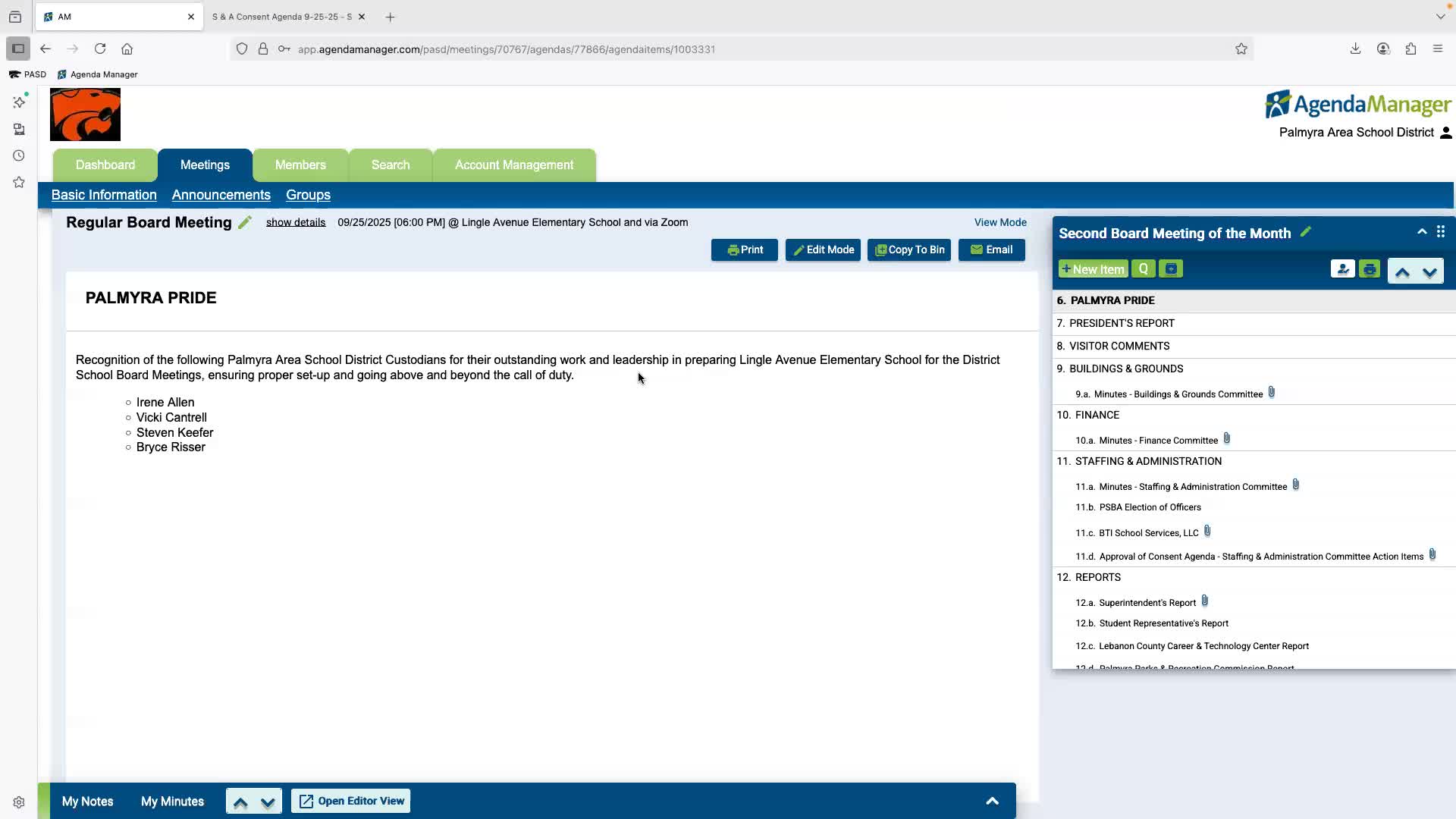 At the September Palmyra Area School District board meeting, district leadership publicly recognized daytime and nighttime custodial staff for extra setup and teardown duties tied to board meetings and district events.