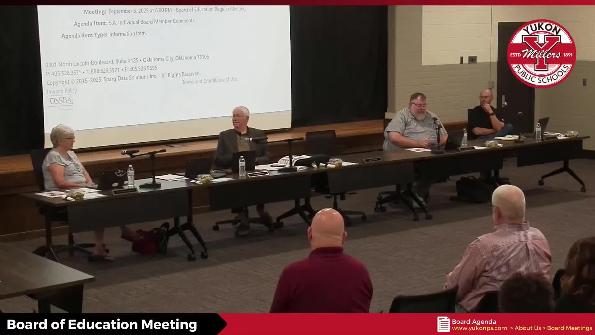 Members of the Yukon Board of Education used the board-communication portion of the meeting to report statewide recognition for district initiatives, describe a local attendance pilot, and flag possible federal funding losses.