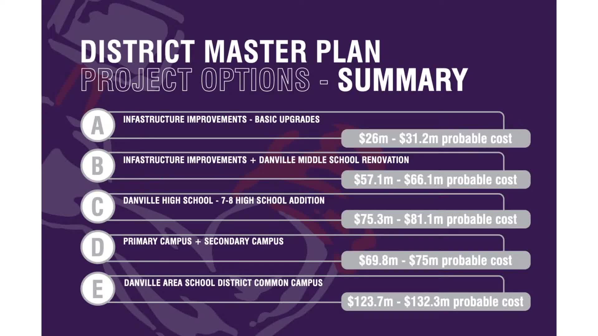 Superintendent Dr. Neath and the long‑range planning committee summarized a recent planning session. The committee removed two high‑cost options from active consideration: building a single consolidated district campus at the present site (choice E) and rebuilding the entire middle school on the current campus (choice B), citing unsustainable price tags relative to the district’s borrowing capacity. Committee members said choices A, C and D remain under consideration with further discussion planned.