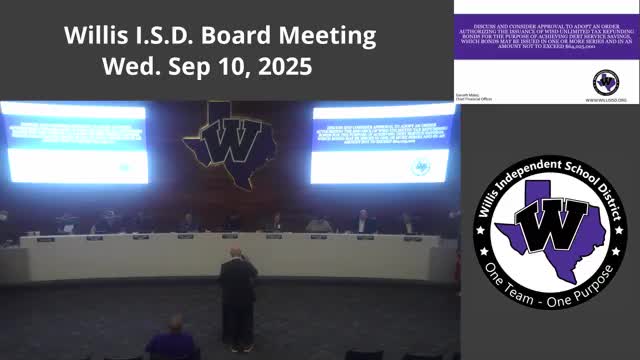 The Willis ISD Board of Trustees voted 7-0 on Sept. 10 to adopt a bond refunding order that establishes a maximum authorization of $64,025,000 to refund previously issued bonds, the district said.