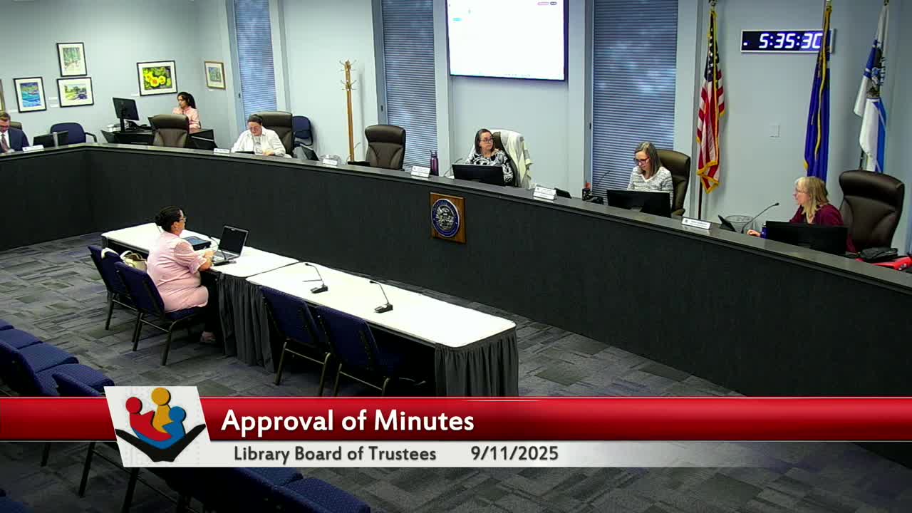 Trustees heard administrative updates on recent hires and promotions, an LSTA digital-resources award for Spanish-language items, an annual Friends donation earmarked for computers, RFID circulation desk installation and upcoming outreach events.