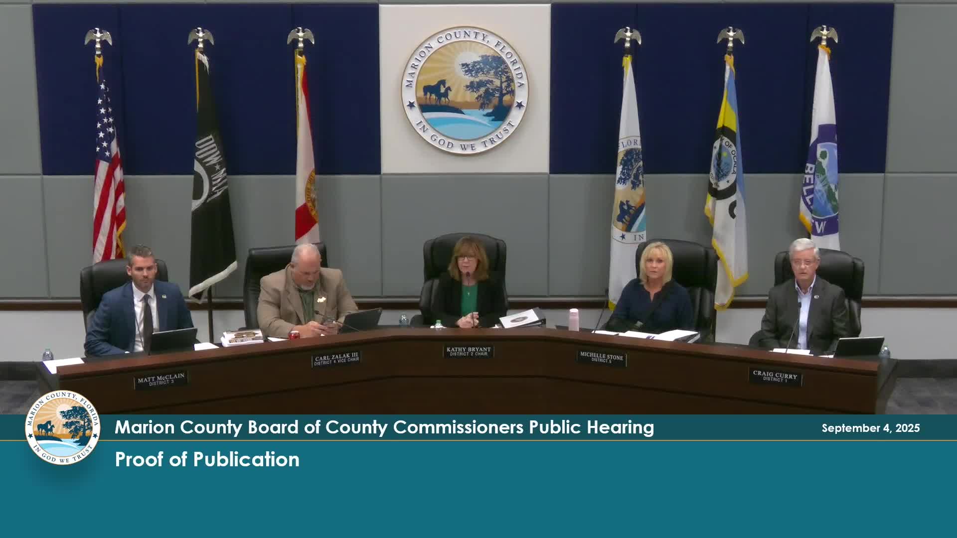 - Marion County (countywide) tentative millage: 3.35 mills; tentative budget: $369,800,488 — motion by Commissioner Stone, second Commissioner Zalick; passed unanimously. - Fine and Forfeiture Fund tentative millage: 0.83 mills; tentative budget: $39,139,051 — motion by Commissioner Stone, second Commissioner Curry; passed unanimously. Fowler and commissioners noted an unanticipated increase in Department of Juvenile Justice billing (discussed as roughly $1.66 million) that raised fund costs. - County Transportation Maintenance Fund tentative millage: 0 mills; tentative budget: $83,857,742 — motion by Commissioner Zalick, second Commissioner Stone; passed unanimously. - Marion County Health Unit Trust tentative millage: 0.11 mills; tentative budget: $5,497,649 — motion by Commissioner Stone, second Commissioner Zalick; passed unanimously. - All other countywide tentative budgets (including infrastructure surtax, solid waste, airport, opioid settlement funds and others): $621,009,044 — motion by Commissioner Stone, second Commissioner MacLean; passed unanimously. - Total countywide tentative millage adopted: 4.29 mills; total countywide tentative budget: $1,119,303,974. - MSTU (law enforcement) tentative millage: 3.72 mills; tentative budget: $126,242,022 — motion by Commissioner Stone, second Commissioner Zalick; passed unanimously. Sheriff Woods spoke in support of needed resources for public safety. - Fire Rescue & EMS tentative millage: 1.11 mills; tentative budget: $104,852,820 — motion by Commissioner Stone, second Commissioner Curry; passed unanimously. Chief Banta spoke about response performance and ISO rating benefits. - Multiple smaller MSTUs and MSBUs — including Rainbow Lakes Estates (0.85 mills; $533,125), Marion Oaks (1.02 mills; $3,384,201), Silver Spring Shores (3.00 mills; $2,170,760), Hills of Ocala MSTU (0.18 mills; $180,024) — were adopted individually or in a mass adoption of remaining districts. The board adopted $300,203,302 in non-countywide budgets in mass by unanimous vote. - The board set the final public hearing to consider final adoption of millage rates and budgets for Sept. 22, 2025, at 6 p.m. in the Marion County Commission chambers — motion passed unanimously.